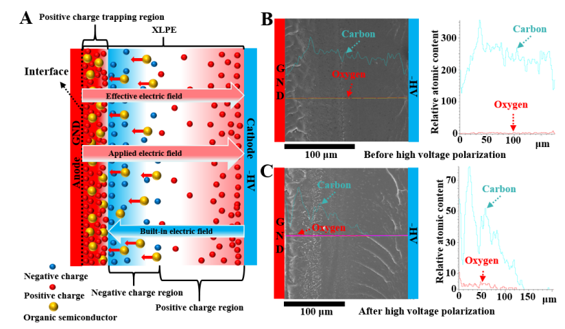 图3. 蒽酮(ET)/XLPE的空间电荷输运机理。(A)电荷输运和蒽酮的迁移。(B, C) ET/XLPE极化前后的SEM图像和EDS分析。碳和氧的均匀分布表明ET在交联聚乙烯中分布均匀。ET/XLPE极化后的SEM图像和EDS分析显示,地电极(GND)附近的碳和氧含量较高,表明蒽酮在该区域聚集。